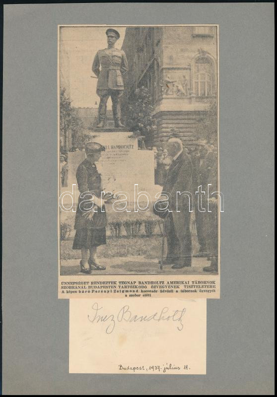 1937 Inez Bandholtz, Harry Hill Bandholtz (1864-1925) amerikai tábornok özvegyének aláírása papírlapon, kartonlapra ragasztva, felette férje szobrának leleplezése 1937-ben, újságkivágáson. Harry Hill Bandholtz (1864-1925) amerikai tábornok, az első világháború után az amerikai katonai misszió parancsnoka Magyarországon. 1919. október 5-én megakadályozta, hogy a megszálló román csapatok kifosszák a Magyar Nemzeti Múzeumot. A szobrot, Ligeti Miklós alkotását a szabadságtéren, 1936. augusztus 23. leplezték le.
