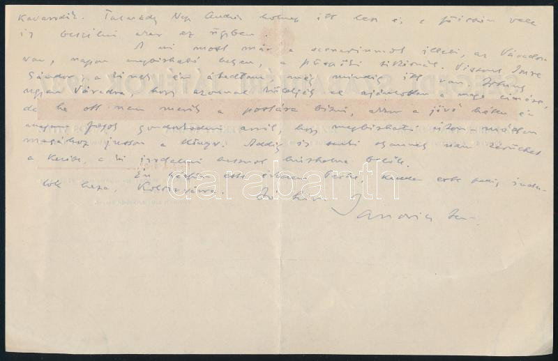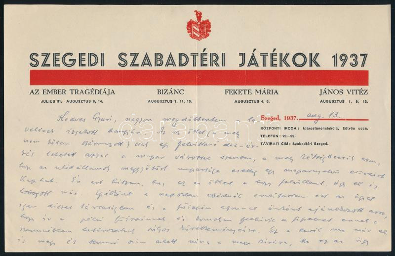 1937 Szeged, Janovics Jenő színész, rendező, színházigazgató, a kolozsvári magyar színház egykori igazgatójának (1932-1933,1945) saját kézzel írt levele Ujházy György írónak, Szegedi Szabadtéri Játékok fejléces papírján