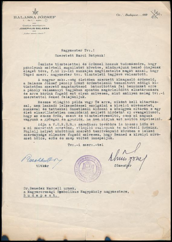 1950 Szabadkőműves levél Benedek Marcell (1885-1969) nagymester részér... https://www.darabanth.com/de/448-Fernauktion/448.0/Kunst-Dokumente-andere-Sammelgebiete/Historische-Dokumenten-Handschriften~1000032/1950-Szabadkomuves-level-Benedek-Marcell-1885-1969-nagymester-reszere~II2974937
