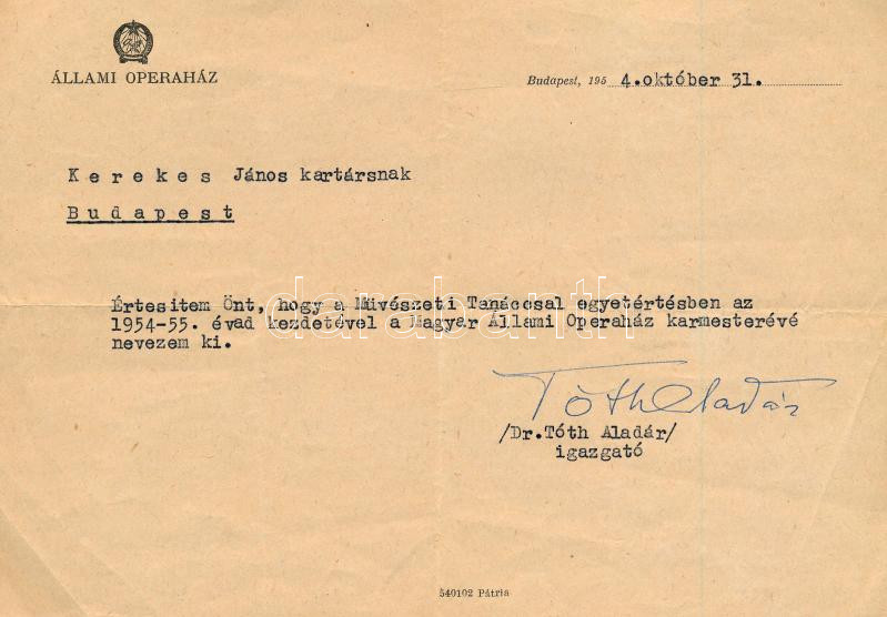 Beschreibung: 1954 Kerekes János (1913-1996) zeneszerző, karmester kinevezése az Operaház karmesterévé, fejléces papíron, az igazgató, Tóth Aladár (1898-1968) Kossuth-díjas zenetörténész, zenekritikus aláírásával.