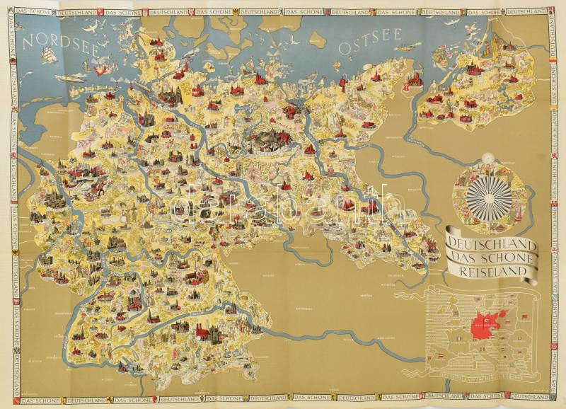 cca 1936 Deutschland, das schöne Reiseland. / Németország (Harmadik Birodalom), kihajtható grafikus térkép és ismertető prospektus, szign.: Riemer, [Alexander], 81x58,5 cm