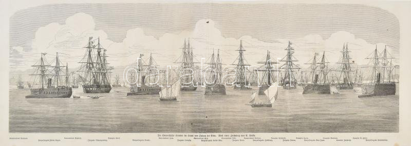 1865 Az osztrák tengeri flotta a Fasanai szorosban. Rotációs fametszet minden hajó nevével. 54x19 cm / The Austrian fleet at anchor in the Fasana Channel near Pola, circa 1865. by A. Verto with the names of the ships 54x19 cm