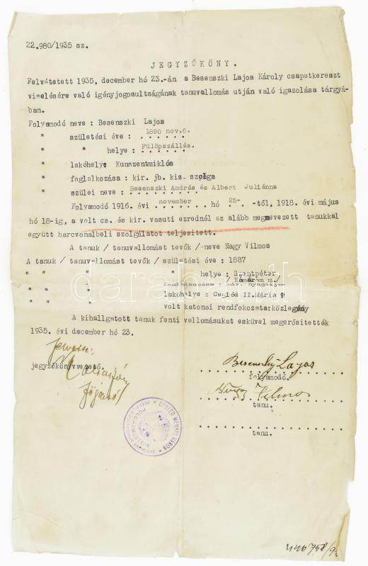 1935 Jegyzőkönyv Károly csapatkereszt igénylésről vasutas ezrednél szo... https://www.darabanth.com/de/448-Fernauktion/448.0/Kunst-Dokumente-andere-Sammelgebiete/Militaria~2000002/1935-Jegyzokonyv-Karoly-csapatkereszt-igenylesrol-vasutas-ezrednel-szolgalt-katonanak~II2977327