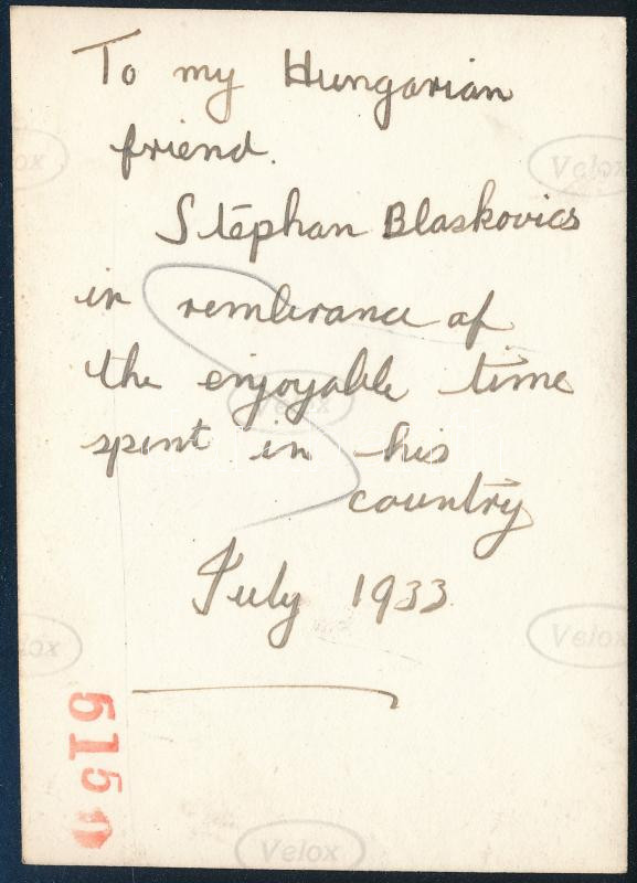 Beschreibung: Külföldi cserkész által aláírt és címzett fénykép az 1933-as 4. Cserkész világdzemborin.
