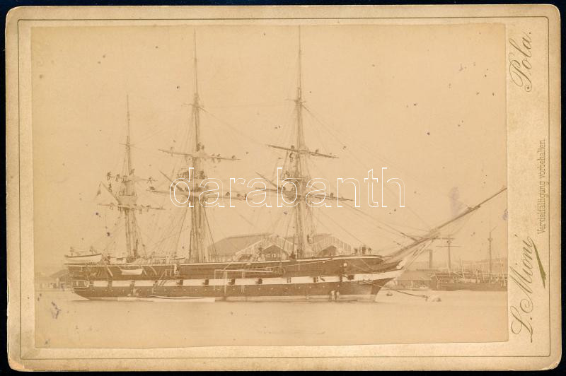 cca 1875 A régebbi S.M.S. Radetzky Polában a fegyverraktár előtt 17x11cm / Full portside view of the old S.M.S. Radetzky in Pola, anchored in front of the Arsenal. Numerous seamen can be seen up in the yardarms and on deck. by L. Mioni, Pola.17x11 cm