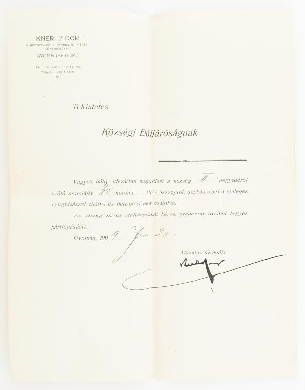 Beschreibung: 1909 Kner Izidor nyomdász autográf aláírása levélen