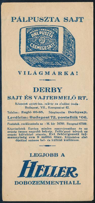 cca 1920 Pálpusztai sajt, Derby Sajt és Vajtermelő Rt. számolócédula https://www.darabanth.com/de/448-Fernauktion/448.0/Kunst-Dokumente-andere-Sammelgebiete/Werbungen~1000024/cca-1920-Palpusztai-sajt-Derby-Sajt-es-Vajtermelo-Rt-szamolocedula~II2974097