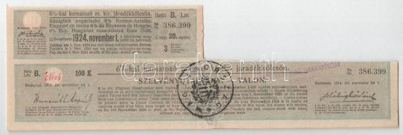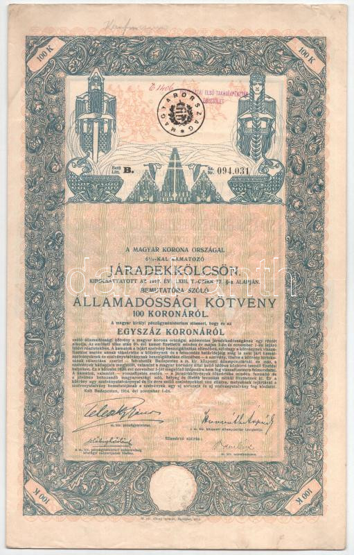 Budapest 1914. "A Magyar Korona Országai 6%-kal kamatozó Járadékkölcsön" bemutatóra szóló államadóssági kötvénye 100K-ról szárazpecséttel, bélyegzéssel, 1db szelvénnyel T:VF,F apró szakadás