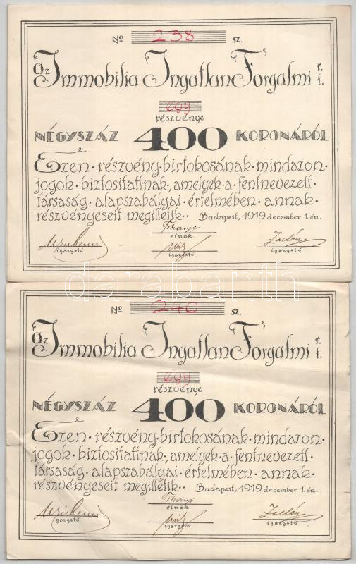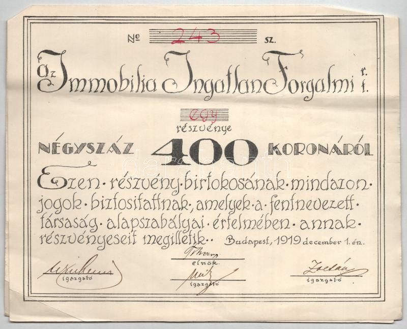 Budapest 1919. "Az Immobilia Ingatlan Forgalmi Részvénytársaság&q... https://www.darabanth.com/de/448-Fernauktion/448.0/Numismatik/Aktien-und-Tickets~500005/Budapest-1919-Az-Immobilia-Ingatlan-Forgalmi-Reszvenytarsasag-reszvenye-400K-rol-szelveny~II2938737