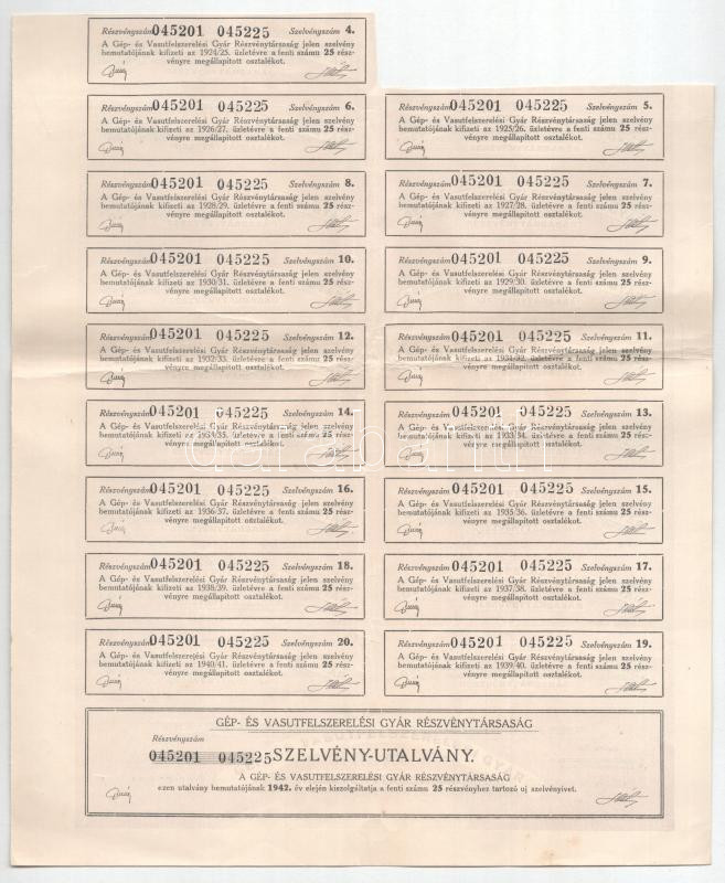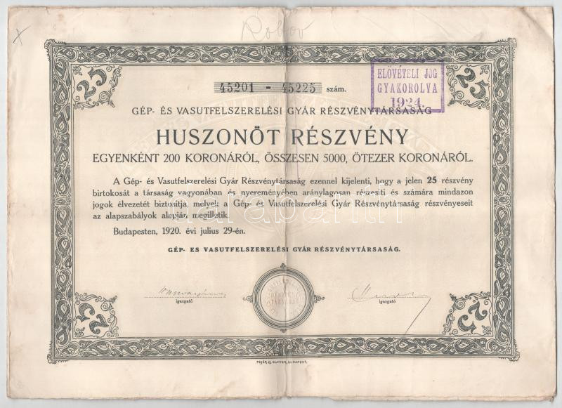 Budapest 1920. "Gép- és Vasutfelszerelési Gyár Részvénytársaság&q... https://www.darabanth.com/de/448-Fernauktion/448.0/Numismatik/Aktien-und-Tickets~500005/Budapest-1920-Gep-es-Vasutfelszerelesi-Gyar-Reszvenytarsasag-25-reszvenye-egyben-egye~II2976939
