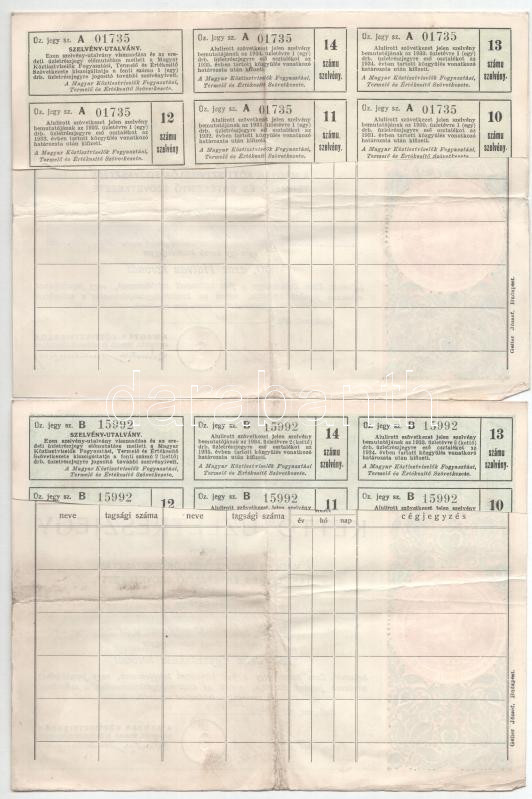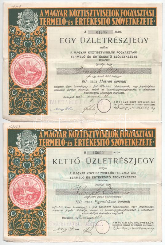 Budapest 1922-1923. "A Magyar Köztisztviselők Fogyasztási, Termelő- és Értékesítő Szövetkezete" üzletrészjegye 60K-ról és 120K-ról, szárazpecséttel, szelvényekkel (2xklf) T:F