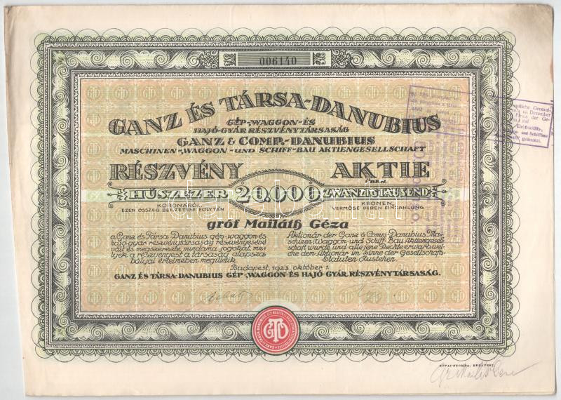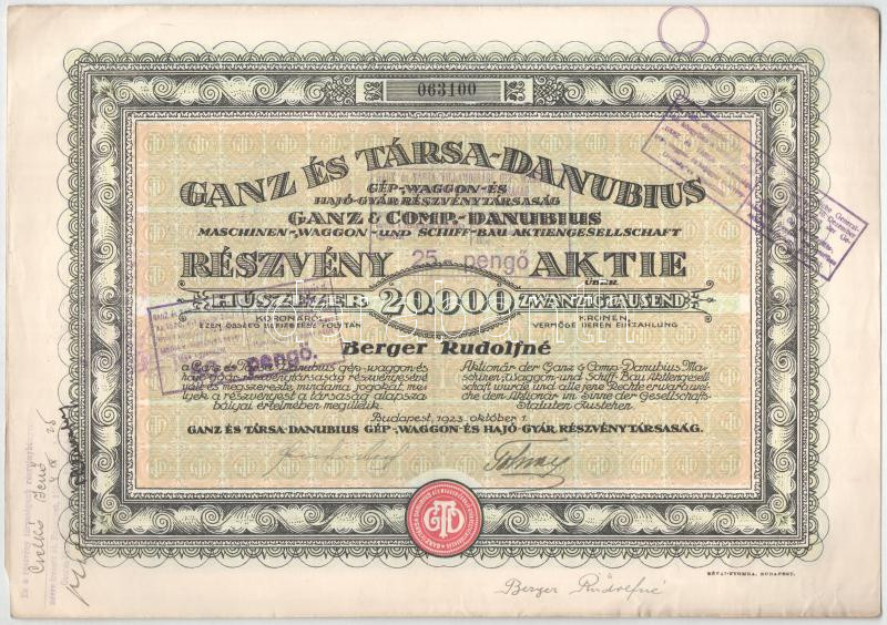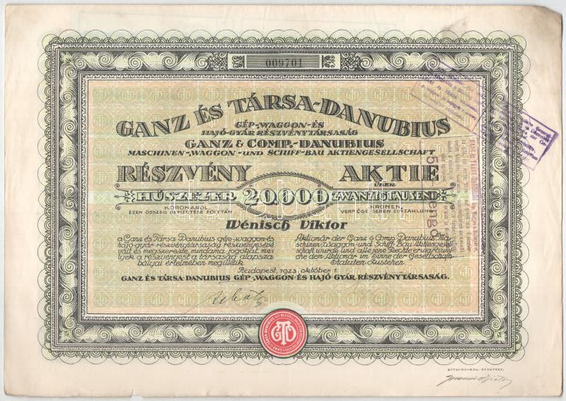 Budapest 1923. "Ganz és Társa- Danubius Gép-, Waggon- és Hajó-Gyár Részvénytársaság" részvénye 20.000K-ról, magyar és német nyelven, szárazpecséttel, bélyegzésekkel és szelvényekkel (3x) T:XF fo.