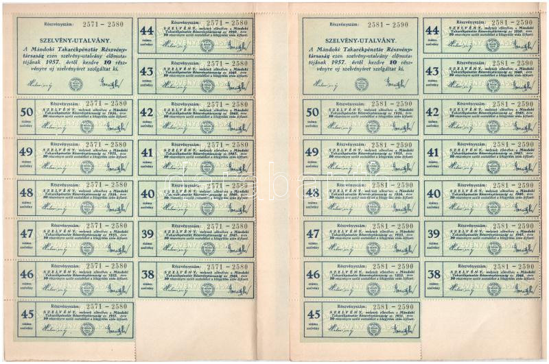 Mándok 1927. "Mándoki Takarékpénztár Részvénytársaság" tíz r... https://www.darabanth.com/de/448-Fernauktion/448.0/Numismatik/Aktien-und-Tickets~500005/Mandok-1927-Mandoki-Takarekpenztar-Reszvenytarsasag-tiz-reszvenye-egyenkent-20P-rol~II2971914
