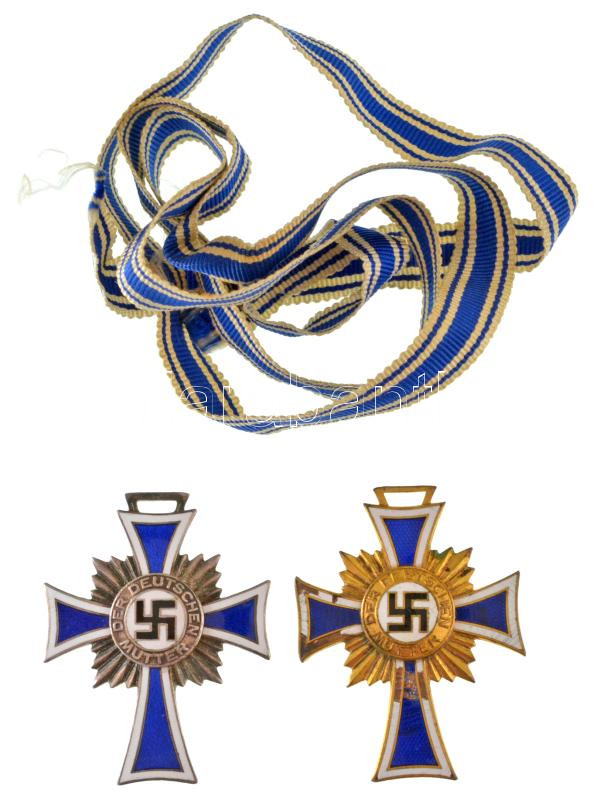 Német Harmadik Birodalom 1938. "Német Anyasági Kereszt, arany és ezüst fokozata" zománcozott, aranyozott, ezüstözött bronz kitüntetés, egyik szalaggal (2xklf) T:XF,VF arany fokozat nagyobb zománchibákkal / German Third Reich 1938. "Cross of Honour of the German Mother, 1st and 2nd class" enamelled, gilt, silver plated bronze decoration, one with ribbon (2xdiff) C:VF,XF, 1st class with larger enamel error