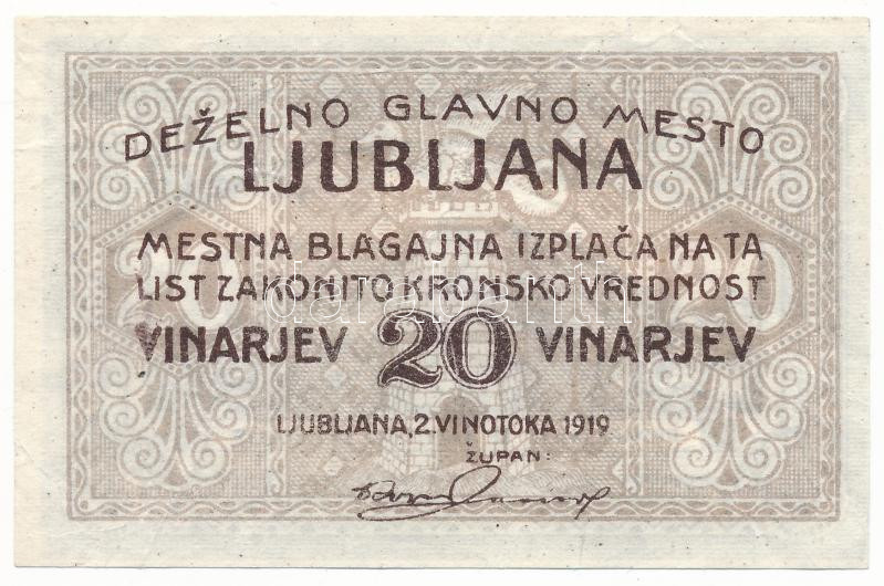 Yugoslavia / Ljubljana 1919. 20 Vinarjev necessity note C:F fine paper