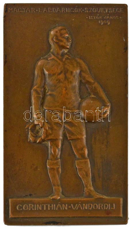 Istók János (1873-1972) 1909. "Magyar Labdarúgók Szövetsége - Corinthián Vándordíj" egyoldalas bronz plakett, hátoldalán gravírozva "1910/11 év Kőszegi György". Kőszegi György (1888-1961) az MTK-nál kezdte a labdarúgást, majd 1908-tól 1921-ig Budapesti TC játékosa volt. Ezután Olaszországban, a Prato SC csapatában folytatta pályafutását mint játékos-edző. 1924-től a CS Firenze, 1926-tól a Pistoiese edzője volt. 1928-ban hazatért, s előbb a BTC-nél, majd a Tatabányánál vállalt munkát, ám 1929-ben visszatért a Pratohoz. Innentől már csak Olaszországban dolgozott, kétszer is edzősködött a Pistoiese együttesénél, de megfordult a Padova, az Anconitana, a Signe, a Taranto és a Catanzarese csapatainál is. 1940-ben elhagyta Olaszországot, s csak a háború után tért vissza, 1947-ben ismét a Prato edzője lett, végül 1949-ben, az Anconitana trénereként vonult vissza a labdarúgástól. Egyszeres válogatott, egy Budapest-Bécs mérkőzésen lépett pályára, melyet az osztrákok 5-2-re megnyertek. (91x50mm) T:XF ph-k, ragasztónyom HP 2950.
