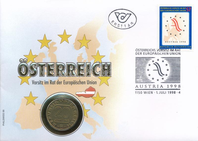 Beschreibung: Ausztria 1991. 20Sch Al-Ni-Br "Franz Grillparzer", "Ausztria az Európai Unió Tanácsának elnöke" érmés borÃtékban, elsÅ‘napi bélyegzéses bélyeggel, német nyelvű leÃrással T:AU Austria 1991. 20 Schilling Al-Ni-Br "Franz Grillparzer" in Austria - Presidency of the Council of the European Union" coin envelope with first day of issue stamp, with German description C:AU