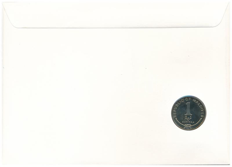 Maldív-szigetek 1982. 1R acél felbélyegzett borítékban, bélyegzéssel, német nyelvű leírással T:UNC Maldives 1982. 1 Rufiyaa steel in envelope with stamp, cancellation and a prospectus in german C:UNC