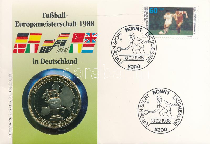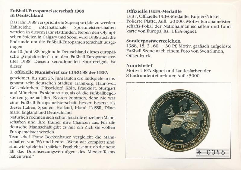 NSZK 1988. "Labdarúgó Európa Bajnokság hivatalos emlékérem" kétoldalas fém emlékérem, felbélyegzett borítékban alacsony "0046" sorszámmal, alkalmi bélyegzéssel (40mm) T:UNC FRG 1988. "European Football Championship official medallion" double-sided metal commemorative medallion, in envelope with low "0046" serial number, with stamp and cancellation (40mm) C:UNC