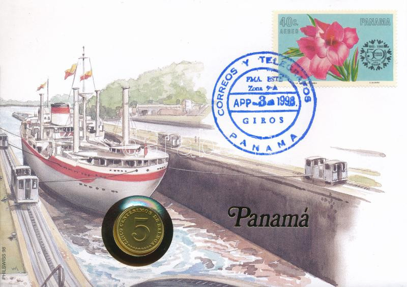 Panama 1996. 5c Cu-Ni felbélyegzett borítékban, bélyegzéssel, német nyelvű tájékoztatóval T:UNC patina Panama 1996. 5 Centesimos Cu-Ni in envelope with stamp, cancellation and a prospectus in german C:UNC patina