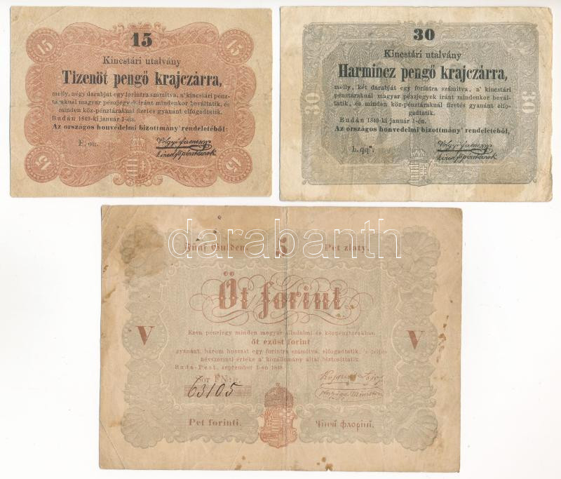 1848. 5Ft "Kossuth bankó" barna nyomat + 1849. 15kr + 30kr &... https://www.darabanth.com/de/448-Fernauktion/448.0/Numismatik/Ungarische-Banknoten~500007/1848-5Ft-Kossuth-banko-barna-nyomat-plus-1849-15kr-plus-30kr-Kossuth-banko-TF-VG--Adamo-G102-G1~II2975436