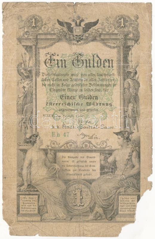 1866. 1G "STN" vízjeles papíron, "Eh47" sorszámmal... https://www.darabanth.com/de/448-Fernauktion/448.0/Numismatik/Ungarische-Banknoten~500007/1866-1G-STN-vizjeles-papiron-Eh47-sorszammal-TG-anyaghiany-Austrian-Empire-1866-1-Gulden~II2965958