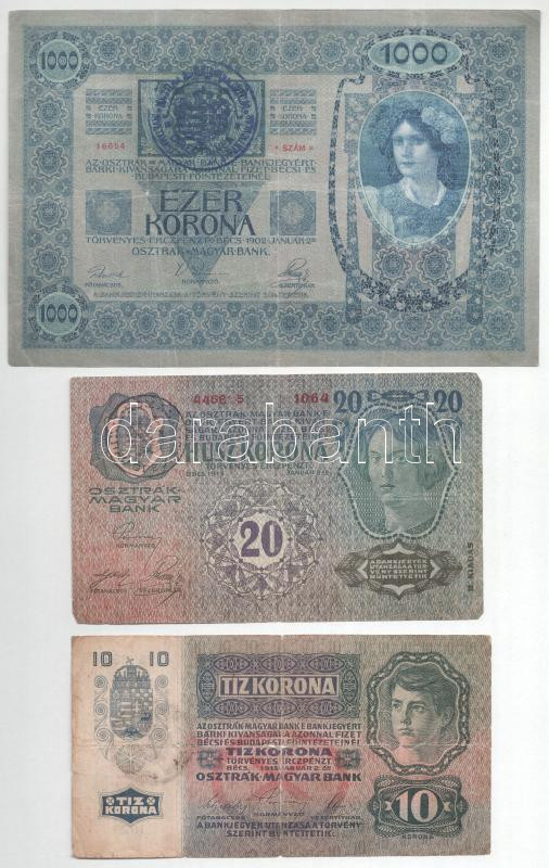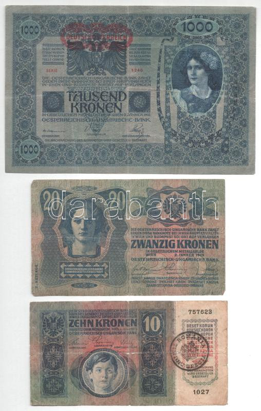 1902. 1000K egyik oldalán piros "DEUTSCHÖSTERREICH", másikon kék román városi felülbélyegzésekkel +1913. 20K "II. kiadás" fekete "ROMANIA TIMBRU SPECIAL" felülbélyegzéssel + 1915. 10K fekete "ROMANIA TIMBRU SPECIAL" felülbélyegzéssel a német oldalon