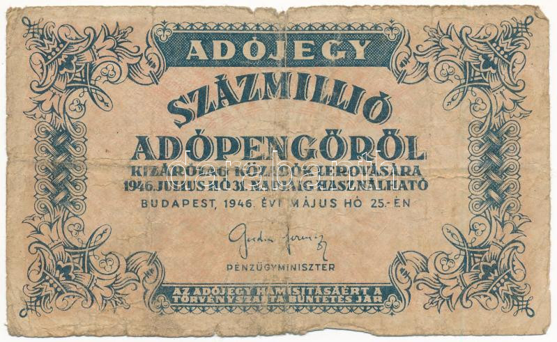 1946. 100.000.000AP T:VG Adamo P55 https://www.darabanth.com/de/448-Fernauktion/448.0/Numismatik/Ungarische-Banknoten~500007/1946-100000000AP-TVG-Adamo-P55~II2966463