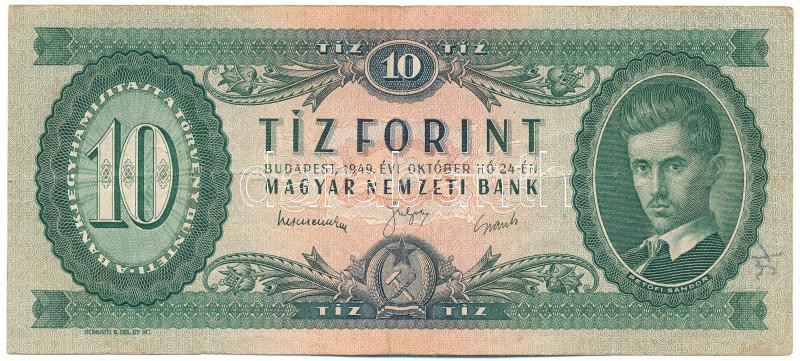 1949. 10Ft T:F,VG Adamo F3 https://www.darabanth.com/de/448-Fernauktion/448.0/Numismatik/Ungarische-Banknoten~500007/1949-10Ft-TF-VG-Adamo-F3~II2974000