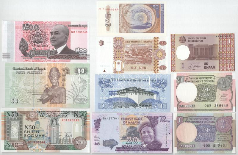 10db klf külföldi bankjegy, közte Moldova, India, Malawi T:UNC,AU egyik tűlyukak