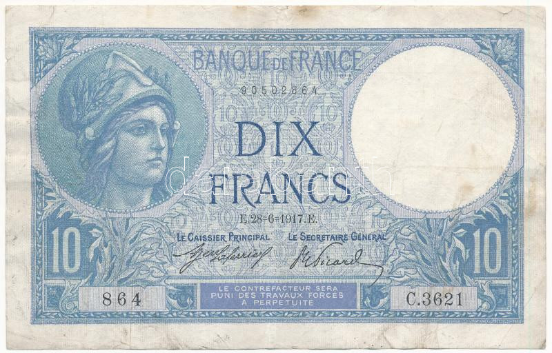 France 1917. 10 Francs C:F https://www.darabanth.com/de/448-Fernauktion/448.0/Numismatik/Weltweit-Banknoten~500013/Franciaorszag-1917-10Fr-TF--France-1917-10-Francs-CF~II2966350