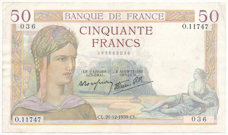 France 1939. 50 Francs C:F fi... https://www.darabanth.com/de/448-Fernauktion/448.0/Numismatik/Weltweit-Banknoten~500013/Franciaorszag-1939-50Fr-TF-szep-papir-France-1939-50-Francs-CF-fine-paper~II2966334