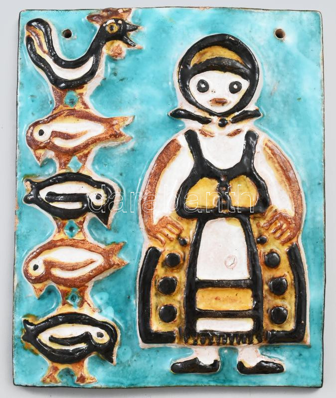 Beschreibung: Borsodi Ágnes: Tyúkokat etető asszony. Mázas kerámia kép, jelzéssel, kopásokkal, 22x18 cm
