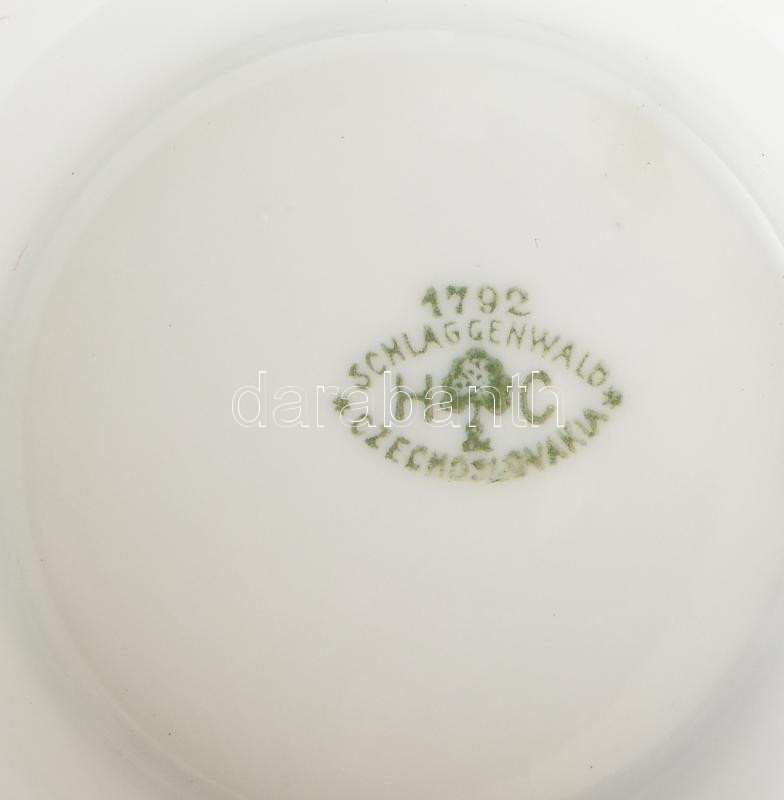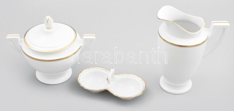 3 darab aranyszélű cseh (Schlaggenwald, tejkiöntő m: 19 és cukortartó m: 15 cm) és német (Schumann Bavaria, fűszertartó) porcelán, mind jelzett, cukortartón apró repedéssel