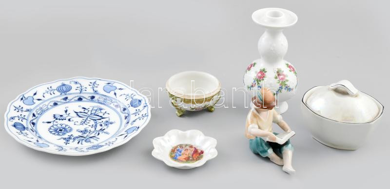 Beschreibung: 6 darabos vegyes porcelán csomag szép darabokkal: Hollóházi irizáló bonbonier, Kispest olvasó fiú, Meissen hagymamintás tál, Herendi bonbonier alsó fele, Wallendorf váza. Jelzéssel, néhol kopással, a tálon pattanással.