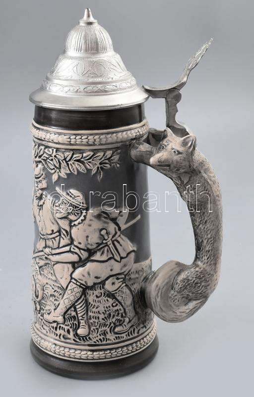 Beschreibung: Gerzit német vadász korsó, rókás füllel, ón fedéllel, jelzett, hibátlan, m: 29 cm