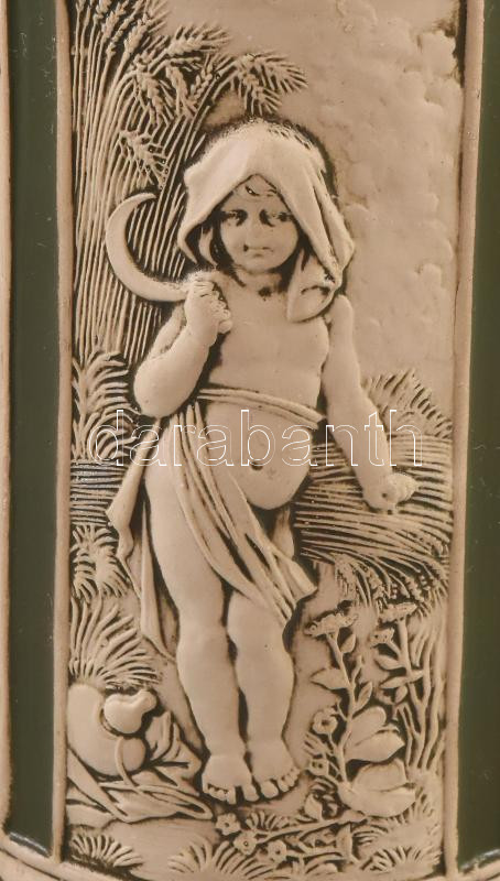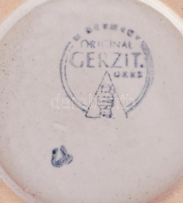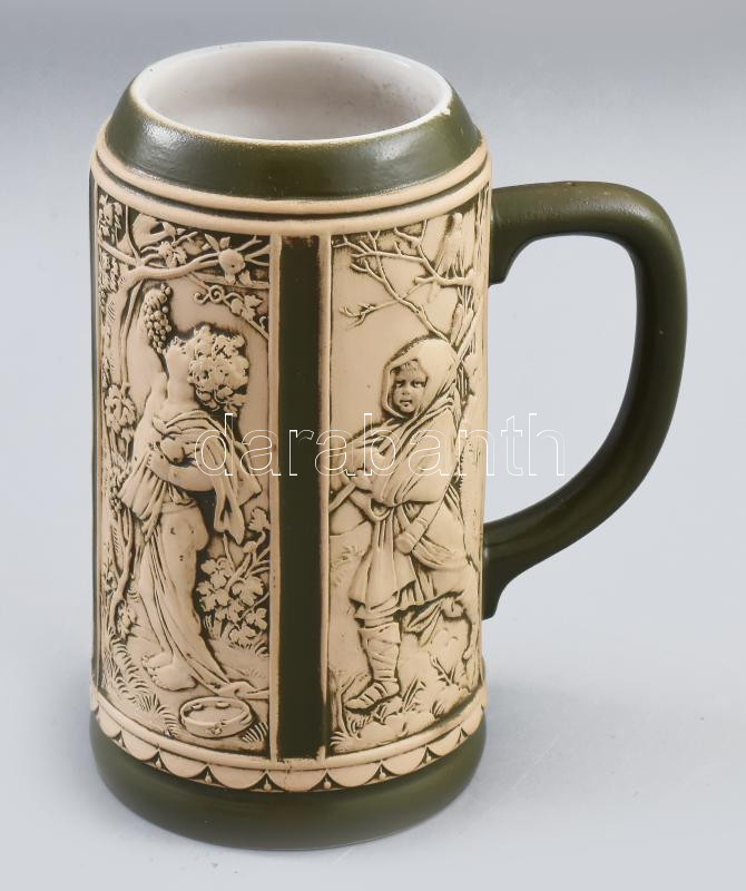Original Gerzit gyűjtői söröskorsó, oldalán képtáblákban biszkvit porcelán jelenetek, mohaszínű mázzal egybekötve, jelzéssel, egy gyári mázhibát leszámítva hibátlan, m:18,5 cm