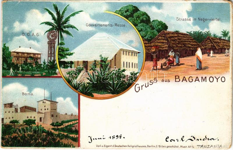 1898 (Vorläufer) Bagamoyo, Deutsch-Ost Afrika, D.O.A.G., Boma, Gouvernements-Messe, Strasse im Negerviertel / government buildings, street view , folklore. Verl. u. Eigent. d. Deutschen Kolonialhauses No. 5. Art Nouveau, litho (Rb)