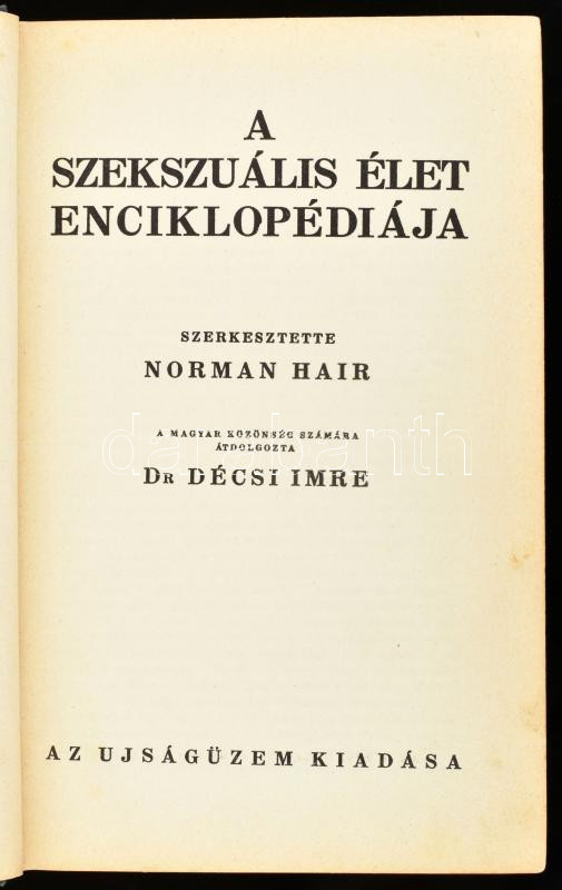 A szekszuális élet enciklopédiája. Szerk.: Norman Hair. A magyar közönség számára átdolgozta: Dr. Décsi Imre. Bp., [1936], Ujságüzem, 360 p. Kiadói aranyozott egészvászon-kötés, kissé foltos, kopottas borítóval, helyenként kissé foltos lapokkal.