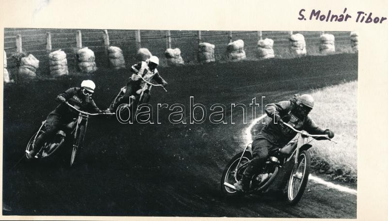 1975 S.Molnár Tibor fotóművész ,,Motorverseny" című alkotása, ezüst zselatinos fotópapíron; a kép a Népművelési Intézet által, Zalaegerszegen megrendezett központi fotós alkotótelep (eredeti fotókat tartalmazó) albumából származik, albumlapra felragasztva, 13x24 cm