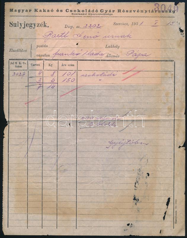 1931 Szerencs, Magyar Kakaó és Csokoládégyár R.T. Súlyjegyzék és Ellen... https://www.darabanth.com/de/449-Fernauktion/449.0/Kunst-Dokumente-andere-Sammelgebiete/Dokument~500020/1931-Szerencs-Magyar-Kakao-es-Csokoladegyar-RT-Sulyjegyzek-es-Ellenorzo-jegy-ragasztek~II2980979