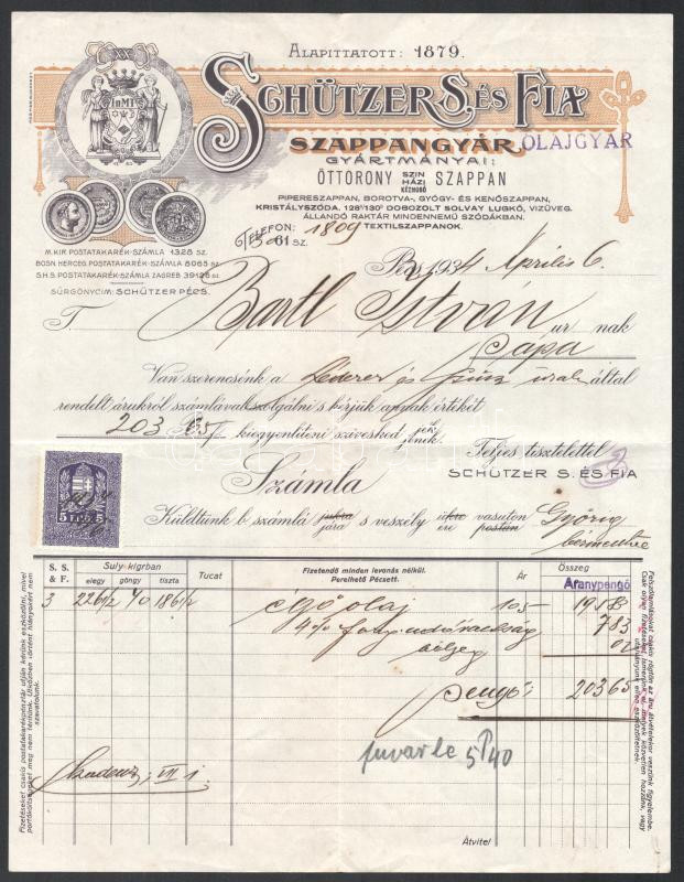 1934 Schützer S. és Fia Szappangyár dekoratív fejléces számla https://www.darabanth.com/de/449-Fernauktion/449.0/Kunst-Dokumente-andere-Sammelgebiete/Dokument~500020/1934-Schutzer-S-es-Fia-Szappangyar-dekorativ-fejleces-szamla~II2979973