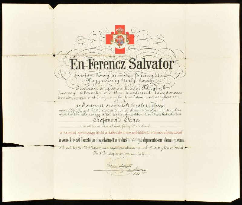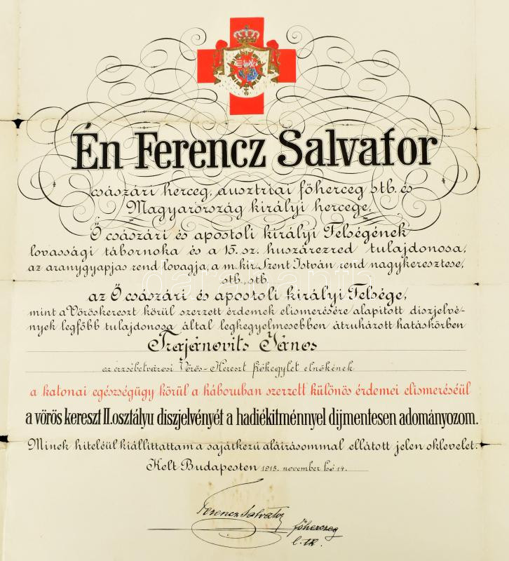 1915 A "Vörös Kereszt II. osztályú Díszjelvénye hadiékítménnyel" kitüntetés adományozó oklevele, Trajánovits János, az erzsébetvárosi Vöröskereszt fiókegylet elnöke részére, "a katonai egészségügy körül a háboruban szerzett különös érdemei elismeréséül", Habsburg-Toscanai Ferenc Szalvátor főherceg (1866-1939) nyomtatott aláírásával, dombornyomott címerrel díszítve. Hajtva, szakadásokkal, 51x42,5 cm
