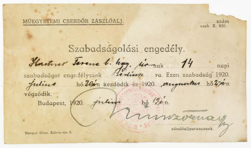 1920 Műegyetemi csendőr zászlóalj szabadságolási engedély sérült https://www.darabanth.com/de/449-Fernauktion/449.0/Kunst-Dokumente-andere-Sammelgebiete/Militaria~2000001/1920-Muegyetemi-csendor-zaszloalj-szabadsagolasi-engedely-serult~II2979649