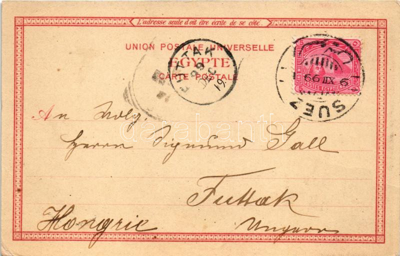 1899 (Vorläufer) Suez Canal, Canal de Suez; Panorama de Suez et de Tacka, Une vue du Canal, Fonatain de Moise / general view, steamship, fountain of Moses. Art Nouveau, floral, litho
