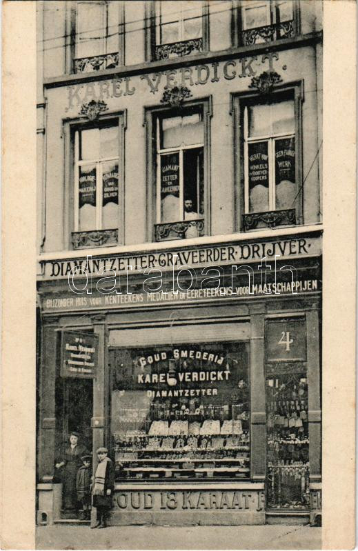 Beschreibung: Antwerpen, Anvers; Karel Verdickt. Vondel-Str. No. 4. Diamantzetter, Graveerder, Drijver / jewellery shop (crease)