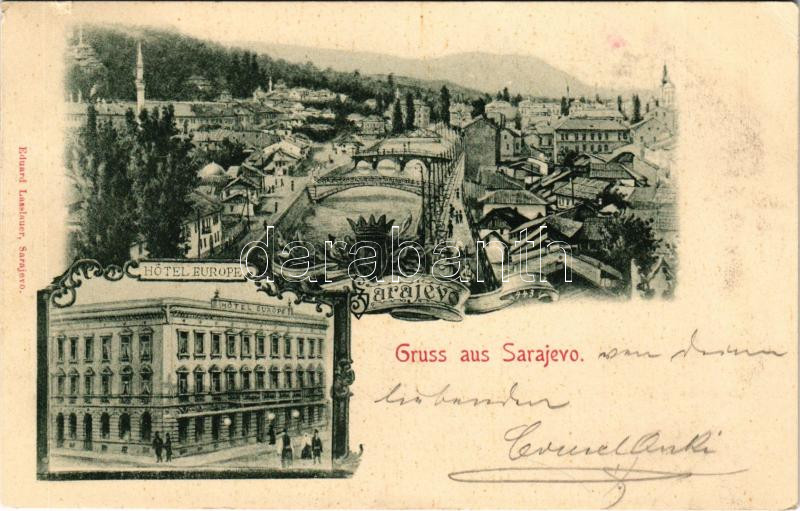 1898 Sarajevo, Hotel Europe szálloda, látkép, híd. Eduard Lasslauer / ... https://www.darabanth.com/de/45-Gross-Auktion/45.1/Ansichtskarten/Bosnien-und-Herzegowina~18776/1898-Sarajevo-Hotel-Europe-szalloda-latkep-hid-Eduard-Lasslauer-hotel-general-view-bridg~II3455917