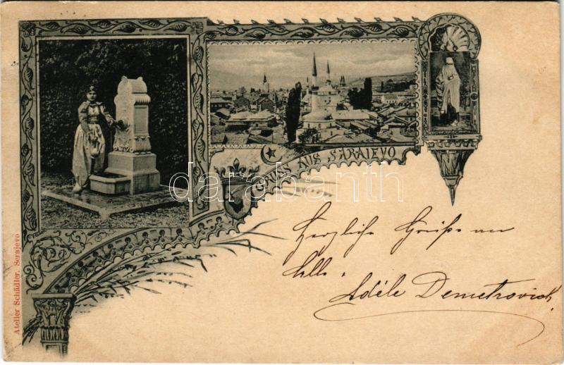 Sarajevo, general view, mosque, Bosnian folklore. Atelier Schädler Art... https://www.darabanth.com/de/45-Gross-Auktion/45.1/Ansichtskarten/Bosnien-und-Herzegowina~18776/Sarajevo-general-view-mosque-Bosnian-folklore-Atelier-Schadler-Art-Nouveau-floral-EK~II3453558