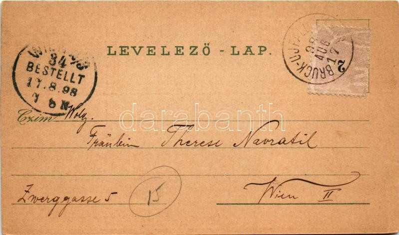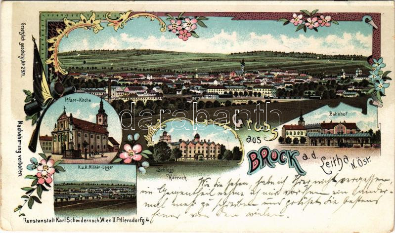 1898 Lajtabruck, Bruck an der Leitha; templom, cs. és kir. katonai laktanya, vasútállomás, Harrach kastély / Pfarr-Kirche, Schloss, Bahnhof, K.u.K. Militär Lager / church, military barrack, railway station, castle. Kunstanstalt Karl Schwidernoch Art Nouveau, floral, litho (vágott / cut)