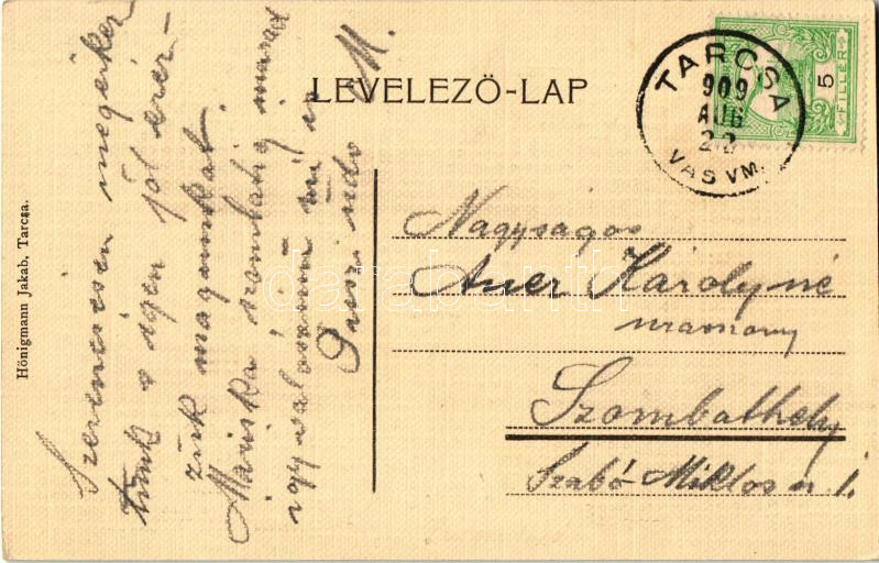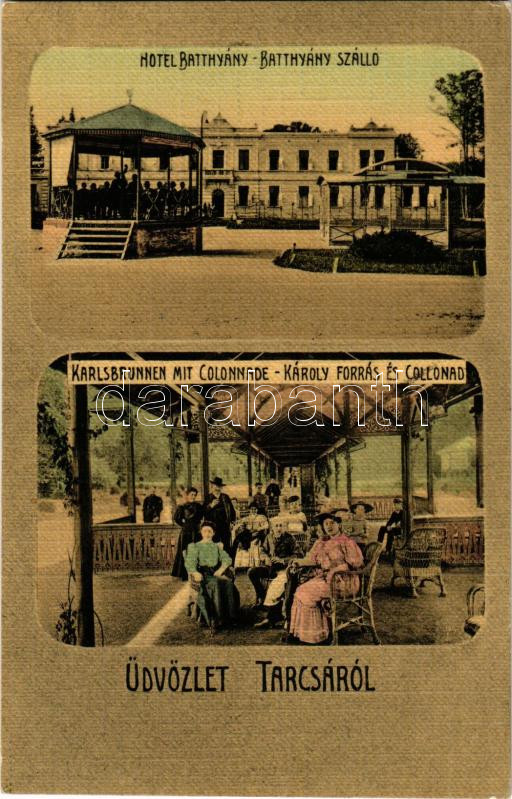 1909 Tarcsa, Tarcsafürdő, Bad Tatzmannsdorf; Batthyány szálloda, Károly-forrás és kolonád. Hönigmann Jakab kiadása / hotel, spa, mineral spring source and colonnade (EK)